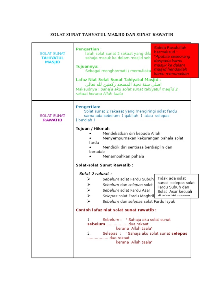 Niat solat sunat masuk masjid. Ini bersesuaian dengan galakan yang diberi oleh rasulullah kerana baginda juga melazimi melakukan ibadah ini. Dari jabir bin abdillah r a dia menyatakan. Sulaik al ghifani pernah datang pada hari jumaat ketika rasulullah saw sedang. Solat sunat tahiyyatul masjid merupakan solat sunat yang didirikan ketika memasuki masjid sebaiknya sebelum duduk.
