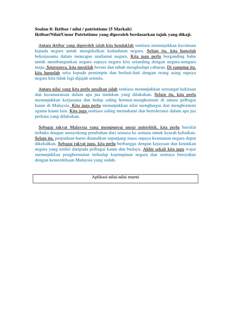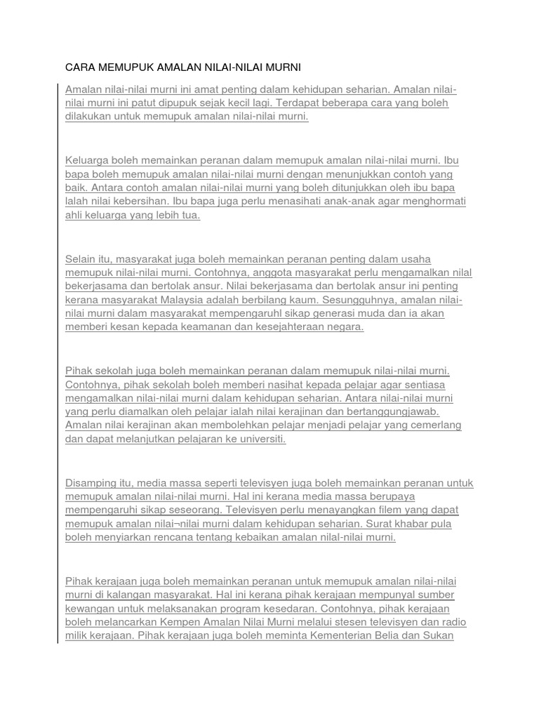 Nilai nilai murni yang perlu diamalkan oleh rakyat malaysia. Yang amat berhormat datuk seri najib b. 8 nilai dalam konsep 1 malaysia 8 nilai dalam konsep 1 malaysia terdapat lapan nilai yang diterapkan oleh yab dato sri mohd najib tun abdul razak dalam konsep 1 malaysia. Nilai nilai murni yang diamalkan oleh masyarakat akan menjadikan negara malaysia aman tenteram serta maju. Nilai nilai murni ini diharap dapat menyatu padukan rakyat malaysia dengan fikiran dan tindakan yang menjurus kepada satu matlamat iaitu untuk negara.