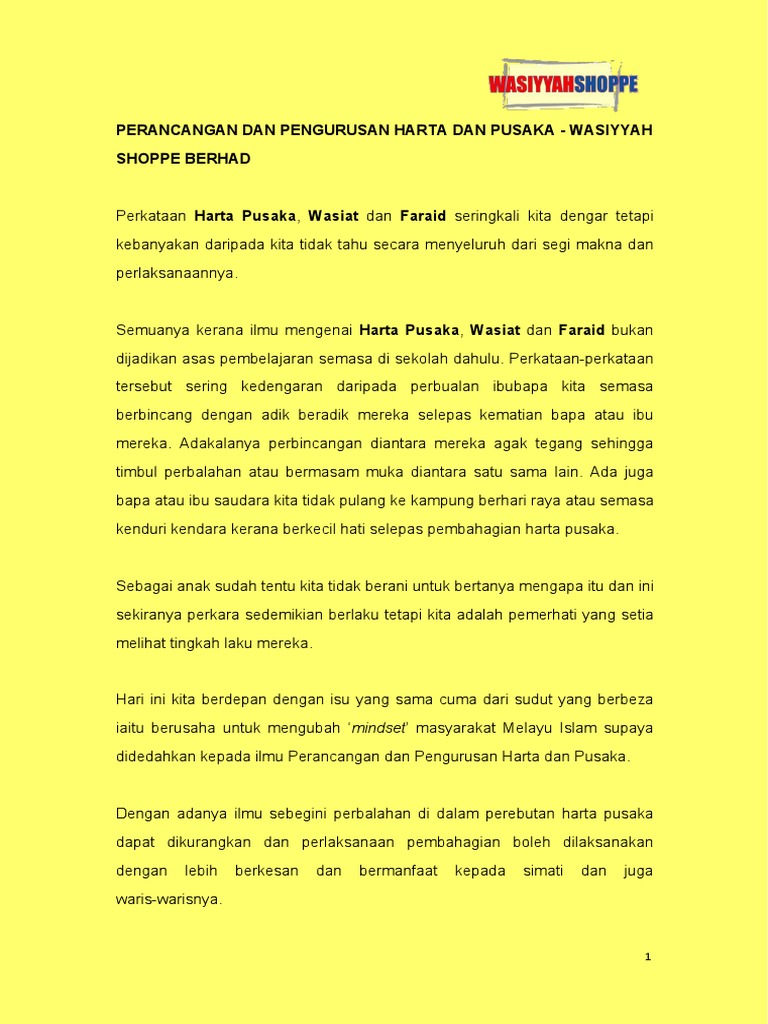 Pembahagian harta pusaka ayah. Pembahagian secara muafakat boleh dilaksanakan jika semua waris yang berhak mewarisi harta pusaka simati bersetuju. Bagaimanapun dua lagi tidak bersetuju dan mahu rumah pusaka itu dibahagikan mengikut faraid. Para ulama mengharuskan takharuj dalam pembahagian harta pusaka. Dalam perancangan harta pusaka seperti mana yang saya kongsikan di artikel sebelum ini 2 langkah awal adalah menyenaraikan harta dan kenal pasti waris yang layak.