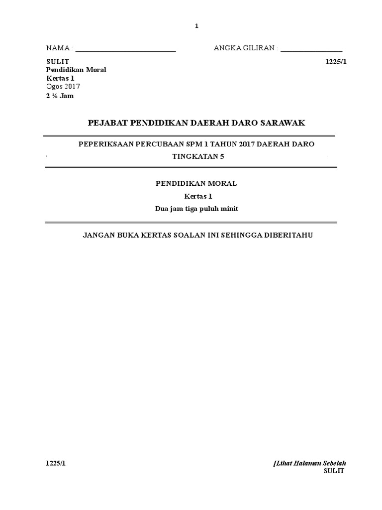 Kertas soalan peperiksaan percubaan pendidikan moral spm 2017 skema jawapan.