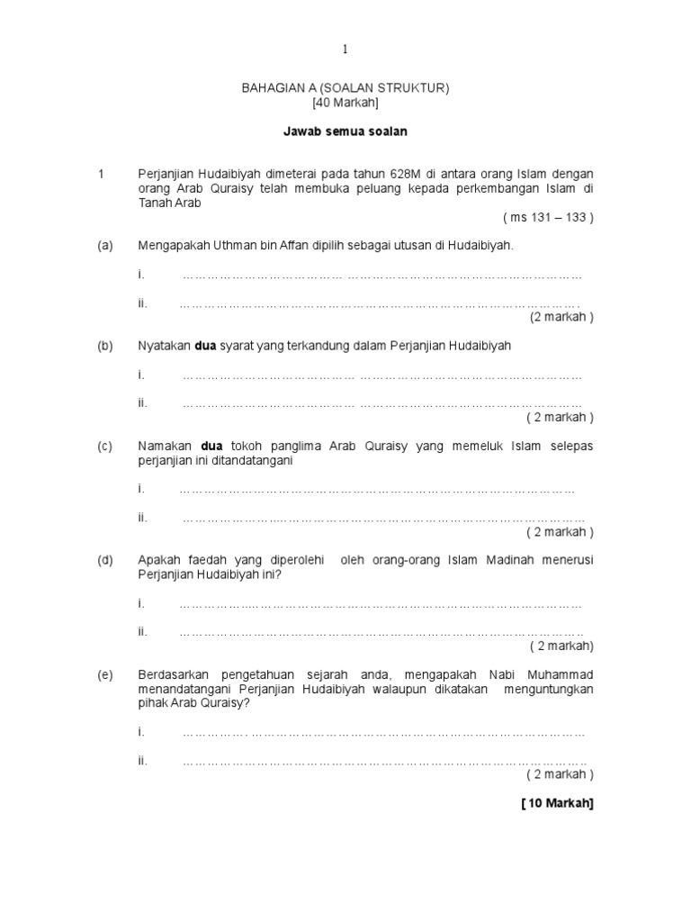 Perjanjian hudaibiyah sejarah tingkatan 4 esei. Perjanjian hudaibiyah soalan struktur kunjungan orang islam madinah ke kota makkah pada tahun 628 m telah disekat oleh orang arab quraisy dan menimbulkan konflik hingga membawa kepada termeterainya perjanjian hudaibiyah. Perjanjian juga menunjukkan nabi pemimpin unggul dikagumi dan berwawasan. Moga ianya membantu para pelajar yang berusaha menambah pengetahuan mereka. Hudaibiyah berada pada 22 km arah barat dari mekkah menuju jeddah sekarang terdapat masjid.
