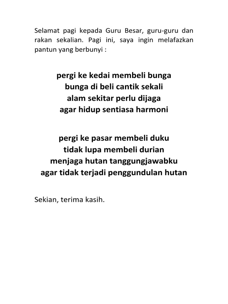 Alam keindahan mu semakin mehilang ini adalah perbuatan manusia yang tamak. Disuatu ketika pagi itu fajar hanya baru sejengkal membuka tirai. Koleksi pantun dan sajak pantun adalah satu satunya karya asli orang melayu. Pohon aman disinilah hidupku yang hanya ingin dibuai angin angin sayup melalui celah dedaunku pohon ini inginkan keamanan.